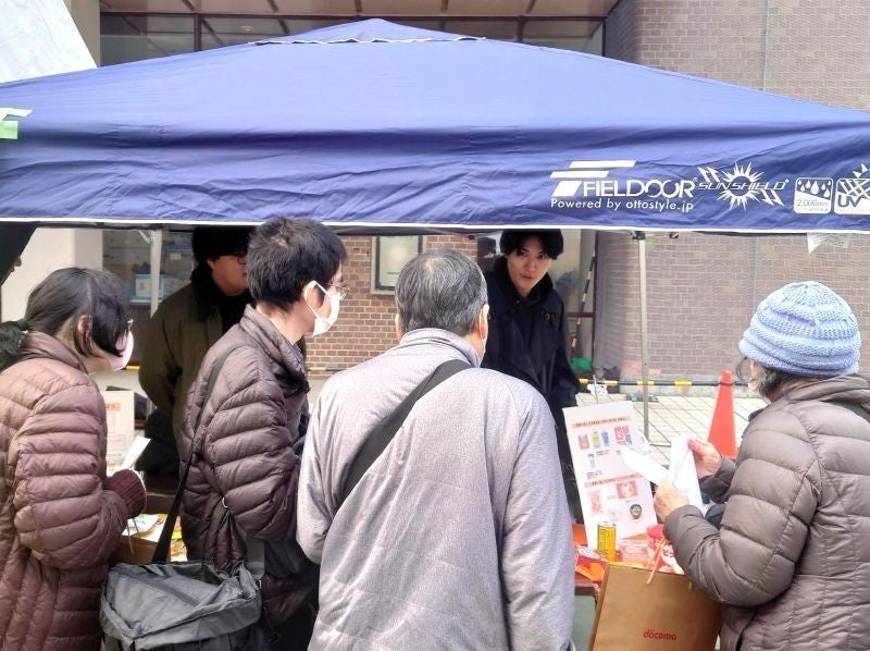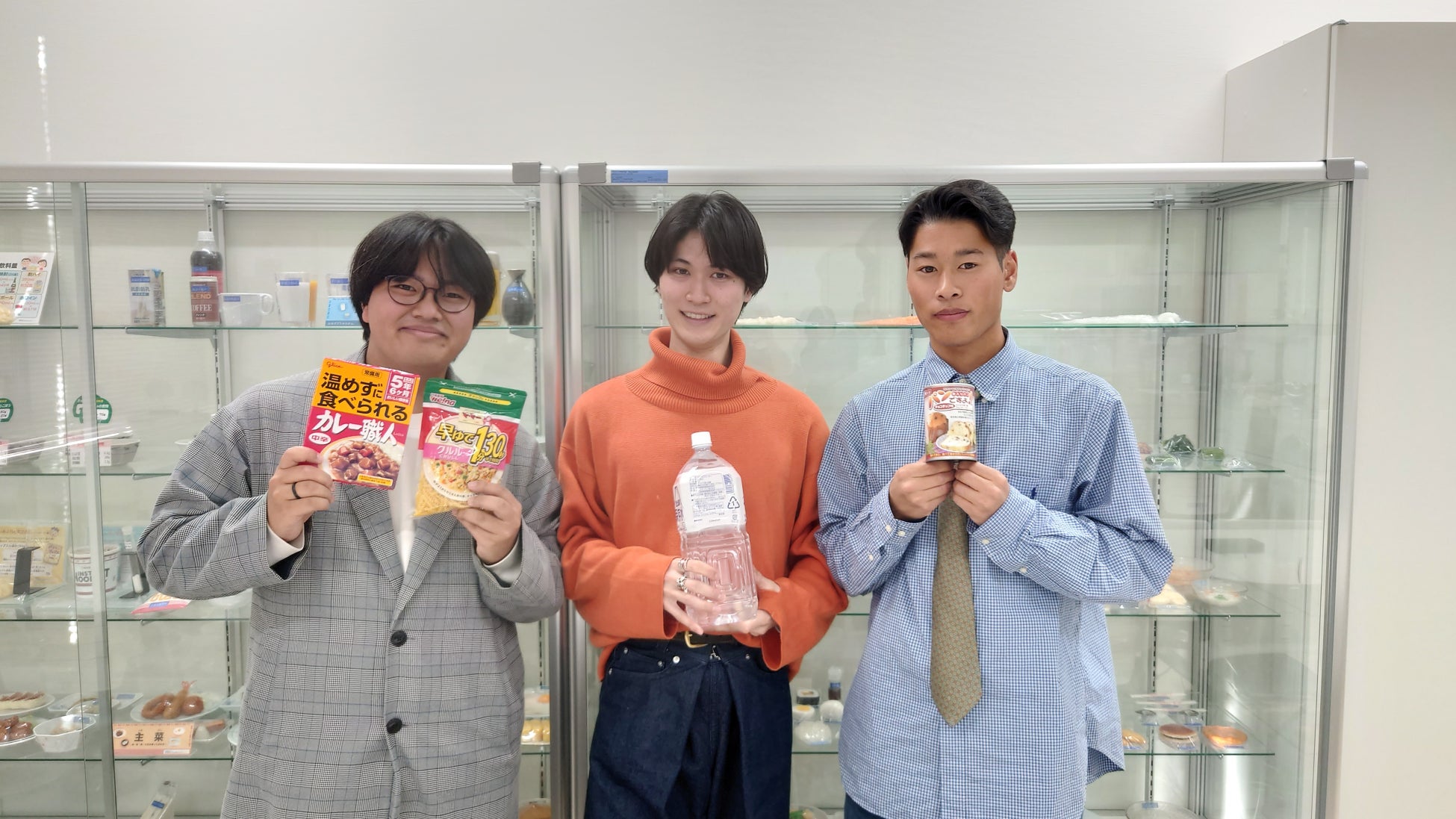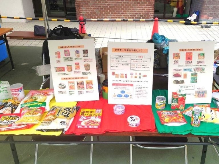 学生たちは来場者と積極的に対話を行い、各家庭での防災対策について意見を交換。非常食や災害食の備蓄状況についてヒアリングし、アルファ米(通常の米に炊飯、乾燥などの一定の処理を施し、長期保存が可能な状態にしたもの)や乾パンの有効活用方法、消費期限切れによるフードロスの防止策として日頃食卓にのぼる賞味期限の長い食品で、備える→消費する→買い足すの「ローリングストック法」を提案しました。