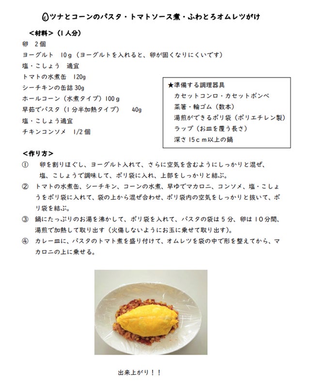 更に、災害でライフラインが停止した状況を想定し、水を使わない調理法も紹介。ツナとコーンのパスタ トマトソース煮、ふわとろオムレツのレシピを提案したほか、耐熱性ポリ袋を使った湯煎調理法なども紹介しました。