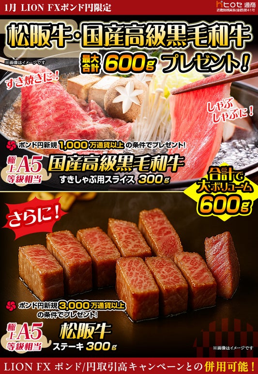 ヒロセ通商株式会社 (本社:大阪府西区、代表取締役:野市 裕作、以下:当社)は、当社の提供する「LION FX」において、2026年1月2日(金)より、「LION FXポンド円限定 松阪牛・国産高級黒毛和牛最大600gプレゼントキャンペーン」を実施することをお知らせいたします。