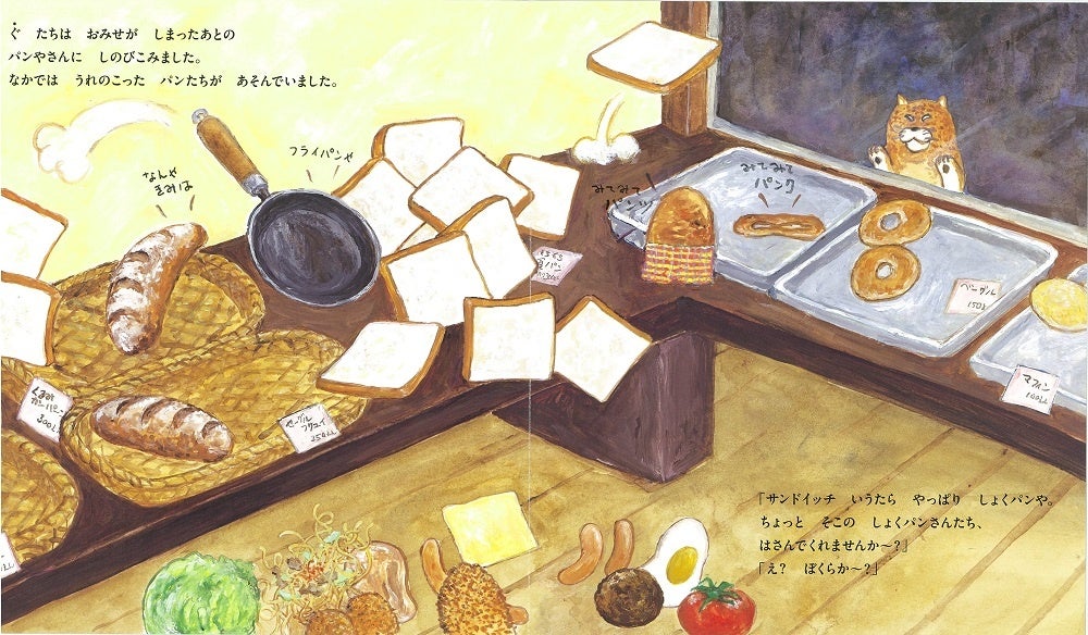おにぎりに入るのを断られた具たちが、「パンならどうや!」と、サンドイッチの具になるために、閉店後のパン屋にしのびこみます。
