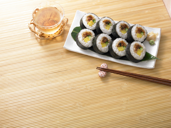 九州産の刻みうなぎを使用した贅沢な太巻寿司です。刻みうなぎ、きゅうり、たまご、れんこんを中具として使用しています。(わさび小袋付)