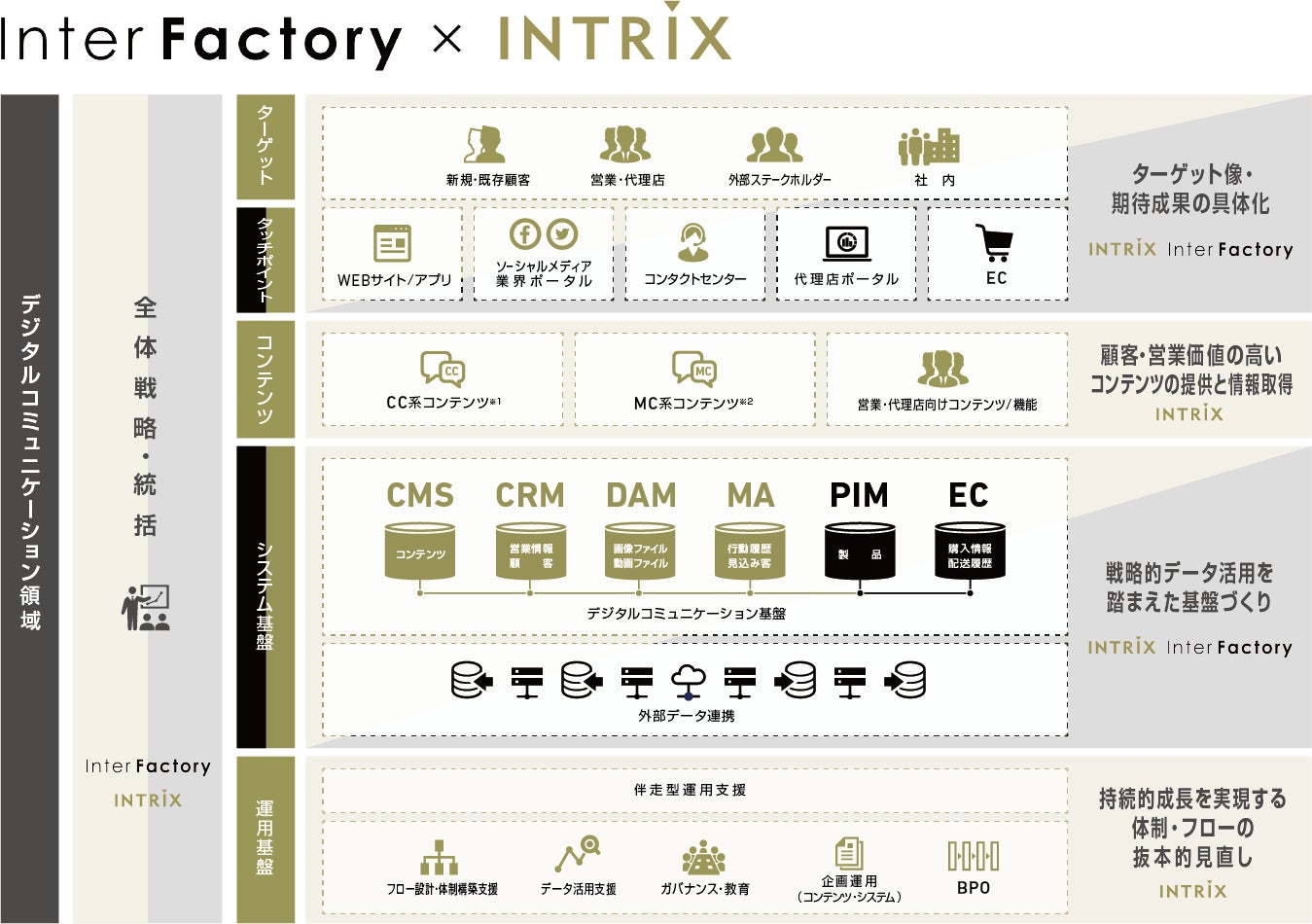 このような状況を踏まえ、この度、イントリックスとインターファクトリーの2社が業務提携を行い、システム面ならびにソリューション面において連携することにより、国内BtoB事業者様のデジタルコミュニケーション領域を総合的に支援してまいります。