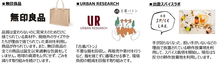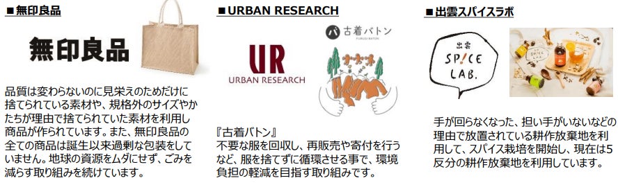 [開催内容] 複数のPOP UP SHOPの展開のほか、3館に出店中のショップで購入可能な、ファッション・ファッション雑貨・ライフスタイルグッズ・コスメ・フードなどサステナブルなグッズをご提案します。※詳しくは特設WEBサイトをご確認ください。