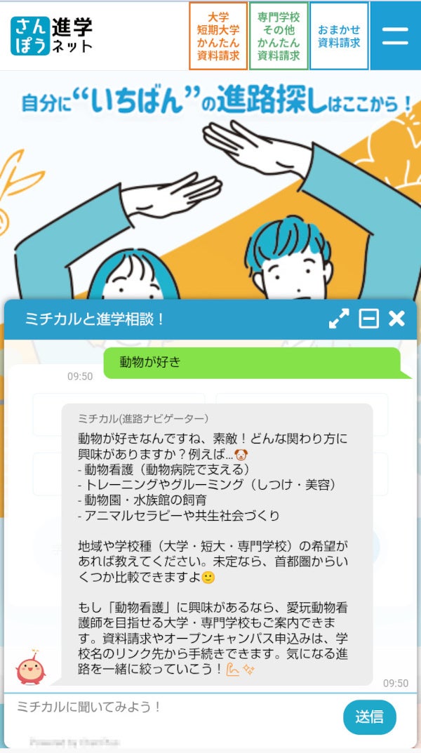 高校生向けの進路情報サービスを展開する株式会社さんぽう(本社:東京都渋谷区、代表取締役社長:渡邉王雄)は、運営する進学ポータルサイト「さんぽう進学ネット」( https://www.sanpou-s.net/ )において、AIが志望校選びをパーソナライズしてサポートする新機能「志望校マッチングAI ミチカル」を実装・公開したことをお知らせいたします。