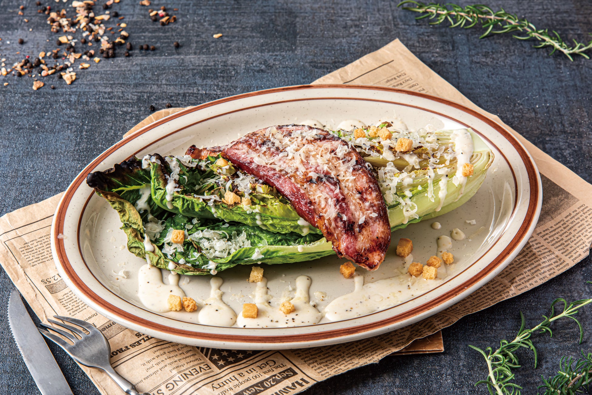 新鮮なロメインレタスを高温でサッと焼き、甘みと香ばしさを+。イベリコ豚のベーコンと一緒にカットして召し上がりください。