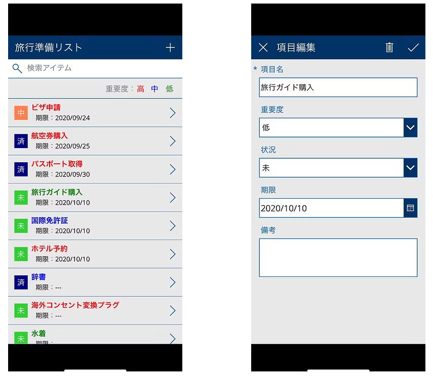 1 旅行準備リスト:旅行の準備に必要な項目を登録し、重要度やステータスで色分けして表示