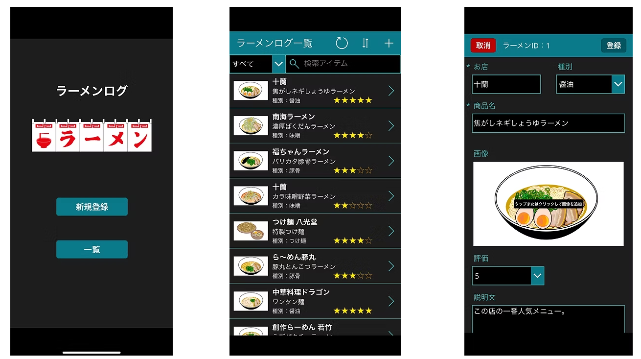 2 ラーメンログ:食べ歩きしたラーメン店名や写真などを登録、5段階の評価を星マークで表示