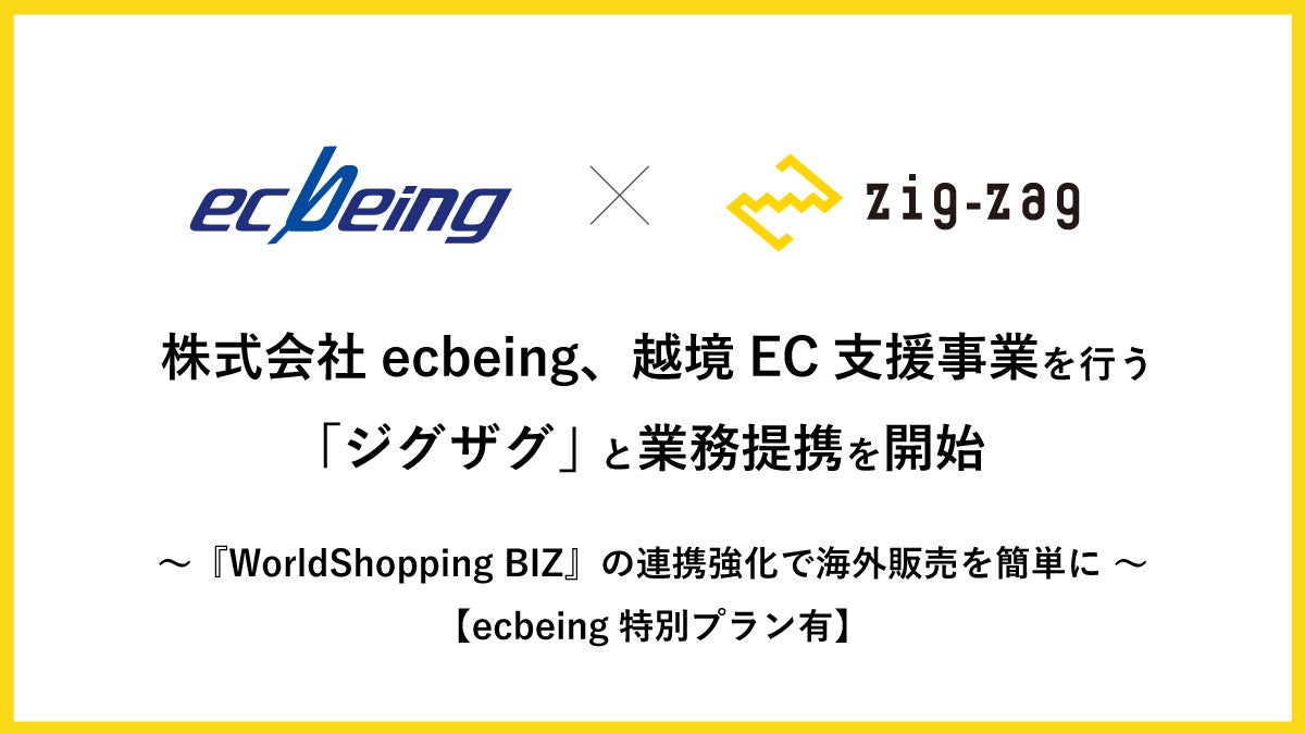 ECサイト構築プラットフォームを提供する株式会社ecbeing (本社:東京都渋谷区、代表取締役社長:林 雅也、以下「弊社」)は、この度、ウェブインバウンド・越境EC支援を行う株式会社ジグザグ(本社:東京都渋谷区、代表取締役:仲里 一義、以下 ジグザグ)と業務提携を開始したことをお知らせします。