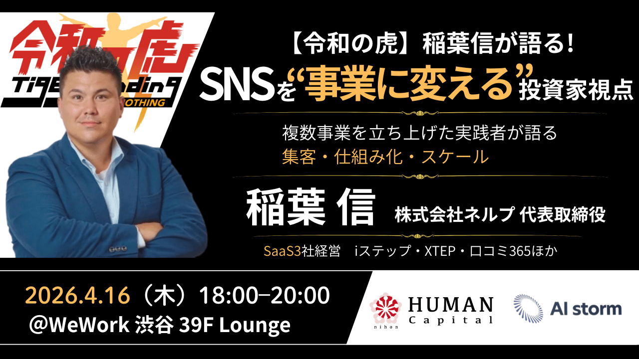 "令和の虎"に投資家として出演し、SaaS企業3社を経営する株式会社ネルプ代表取締役 稲葉信氏を招き、投資家の視点から紐解く事業成長の構造を、実体験とともに語っていただきます。