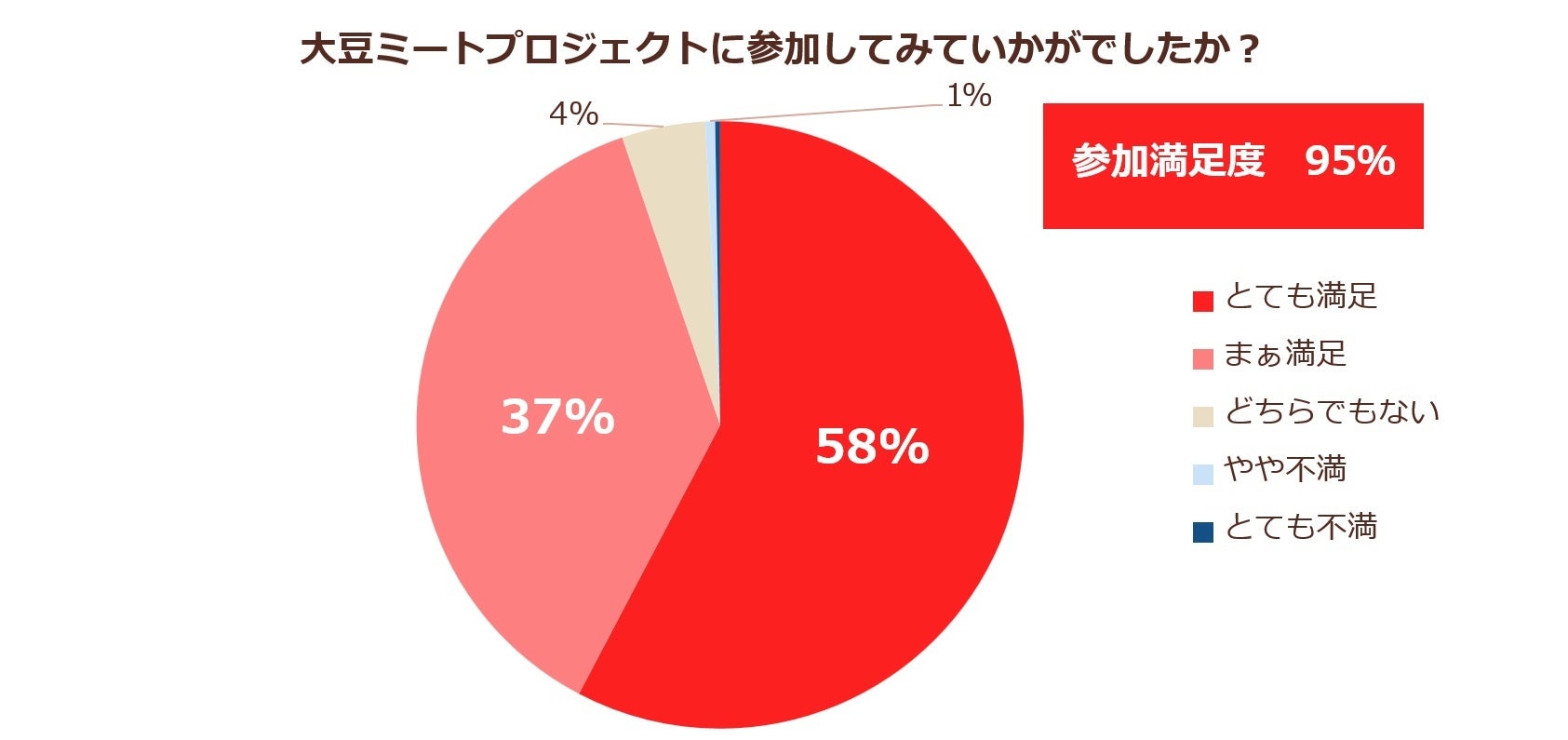 毎月29日の肉の日に、大豆ミートを使った料理を投稿するキャンペーンを中心とした「大豆ミートプロジェクト」への参加満足度は95%にのぼり、うち58%は「とても満足」と回答しました。