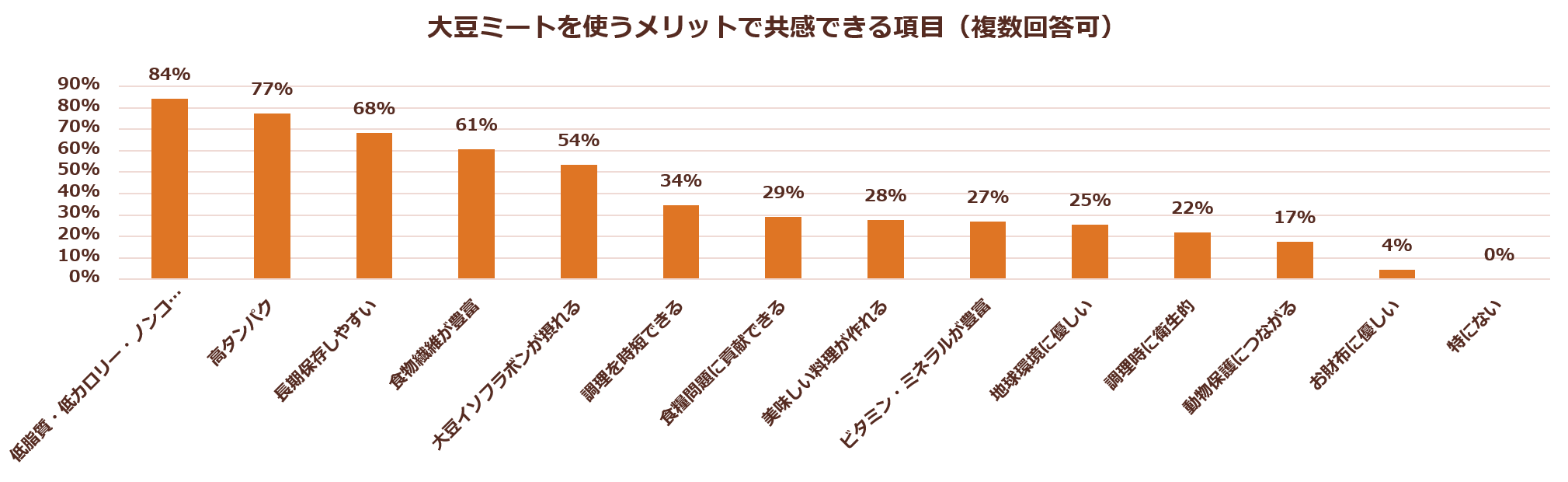 大豆ミートを使うメリットでは、「低脂質・低カロリー・ノンコレステロール」が最多の84%、ついで「高タンパク」(77%)、3番手に「長期保存しやすい」(68%)と、食生活に取り入れた経験ならではの価値実感も得られたことがうかがえる結果となりました。