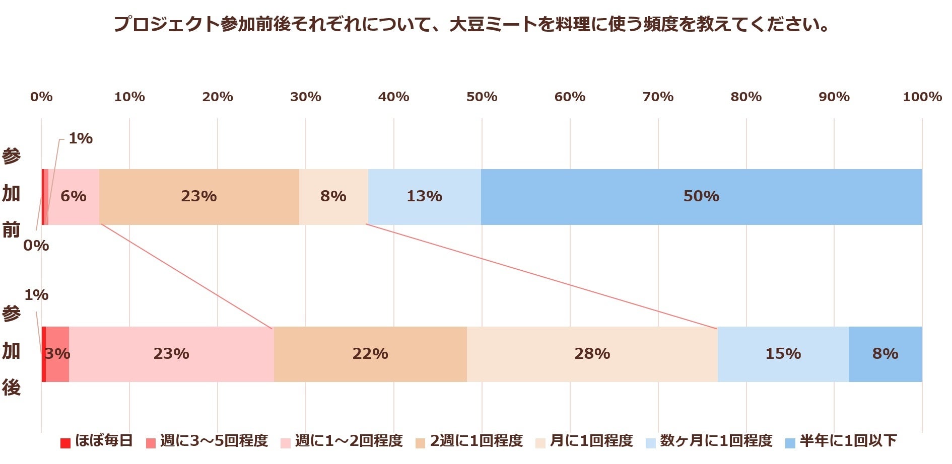 プロジェクト参加前後の、大豆ミート料理使用頻度の変化では、「週1回以上」は7%→27%(+20pt)に、「月1回以上」は33%→77%(+44pt)に増加しており、大豆ミートを料理に取り入れる用になった人が大幅に増加したことがわかります。