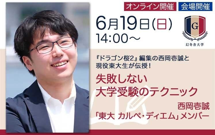 【6/19(日)開催】『東大大全』刊行記念!『ドラゴン桜2』編集の西岡壱誠と現役東大生が伝授する「失敗しない大学受験のテクニック」