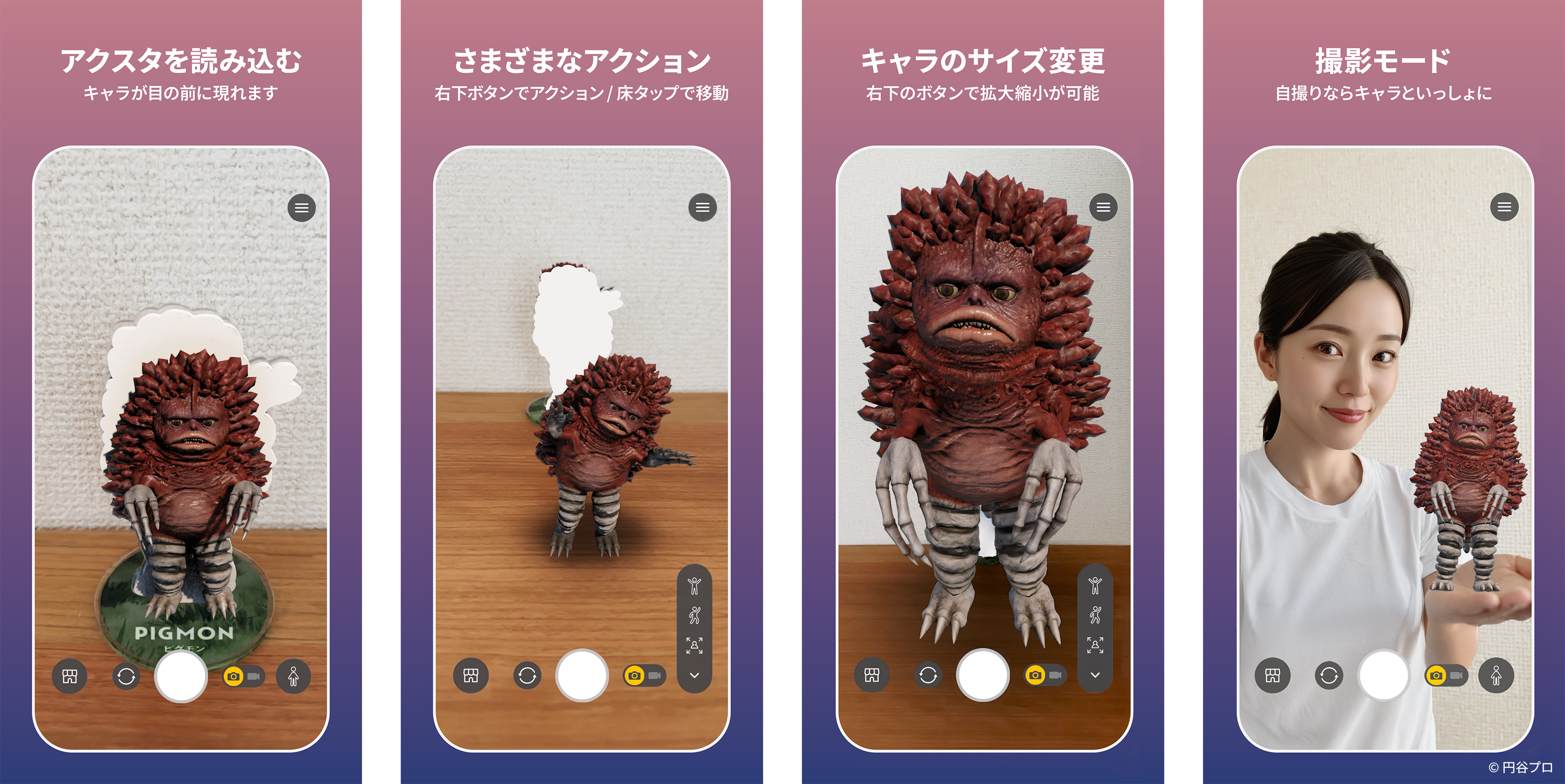 お気に入りの場所に登場させたり、ポーズやアクションを楽しんだり、キャラクターとの自撮り撮影も可能です。