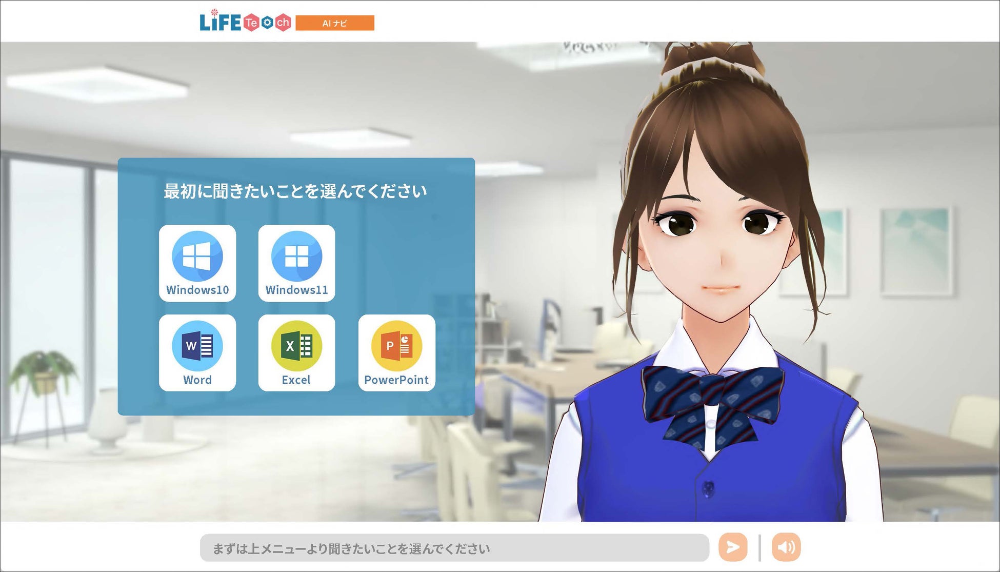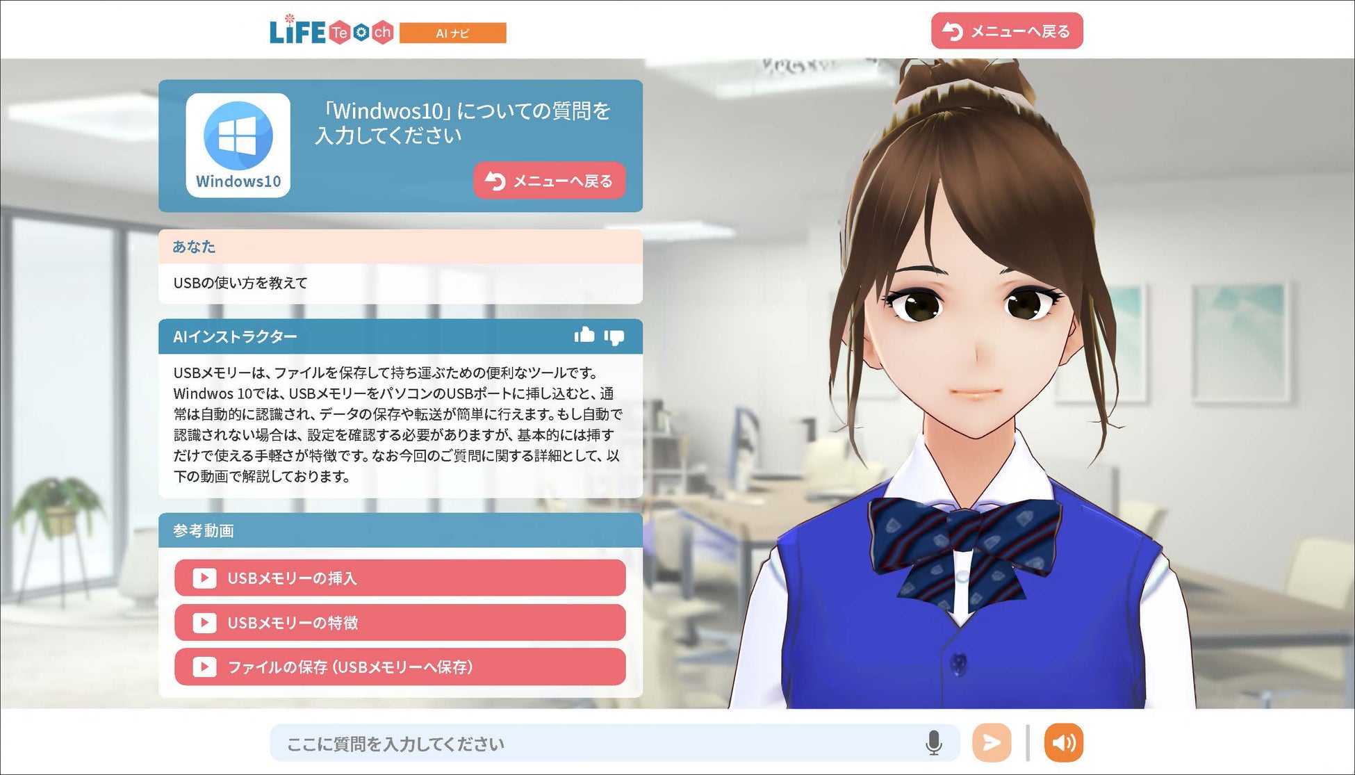 ユーザーがテキスト入力または音声入力でWindows OSやMicrosoft Officeなどの使い方に関する質問をすると、AIがテキストや合成音声で回答し、質問に適した解説動画を提示します。