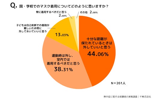 園・学校でのマスク着用についてどのように思うか質問したところ、「十分な距離が保たれているときは外していいと思う(44.06%)」「運動時は外し、室内では着用するべきだと思う(38.31%)」「子どもは自己判断での着脱が難しいため常に外しておいていいと思う(13.03%)」「常に着用するべきだと思う(2.68%)」「その他(1.92%)」という結果になりました。