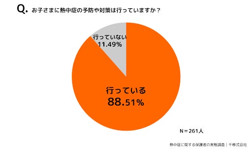 子どもの熱中症対策を行っているか質問したところ、「行っている(88.51%)」「行っていない(11.49%)」という結果になりました。