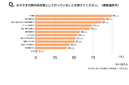 子どもの熱中症対策として行っていることを質問したところ、「水分補給(99.57%)」が最も多く「帽子を着用する(90.91%)」「気温・体温に合わせて衣類を調整する(86.15%)」が続く結果となりました。