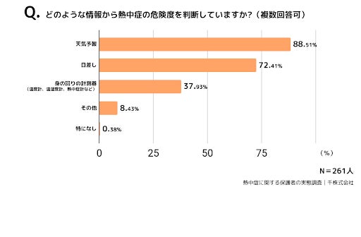 また、どのような情報から熱中症の危険度を判断しているか質問したところ「天気予報(88.51%)」「日差し(72.41%)」「身の回りの計測器(温度計、温湿度計、熱中症計など)(37.93%)」「その他(8.43%)」「特になし(0.38%)」という結果になりました。
