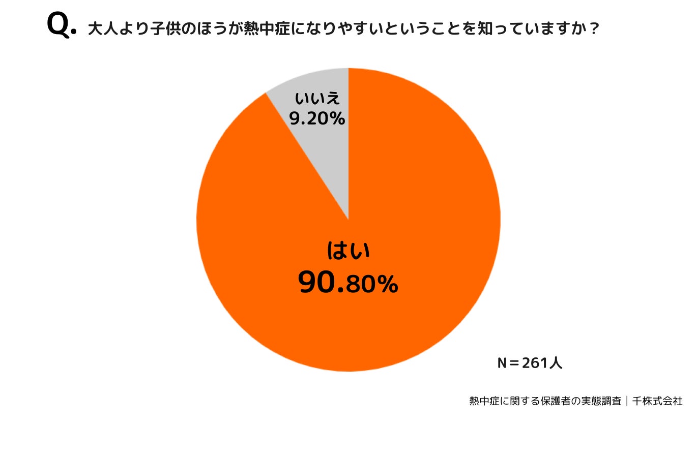 調査の結果、大人より子どものほうが熱中症になりやすいということを知っているか質問したところ、はいと答えたのは90.80%と9割の保護者が認知している結果となりました。