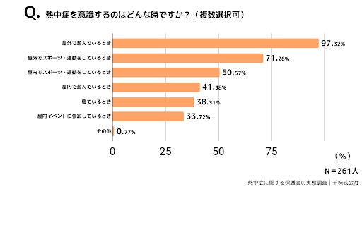 熱中症を意識するタイミングについて質問したところ、「屋外で遊んでいるとき(97.32%)」が最も多く「屋外でスポーツ・運動をしているとき(71.26%)」「屋内でスポーツ・運動をしているとき(50.57%)」が続く結果となりました。