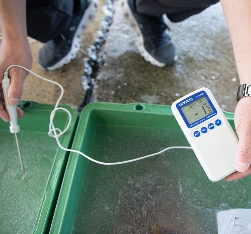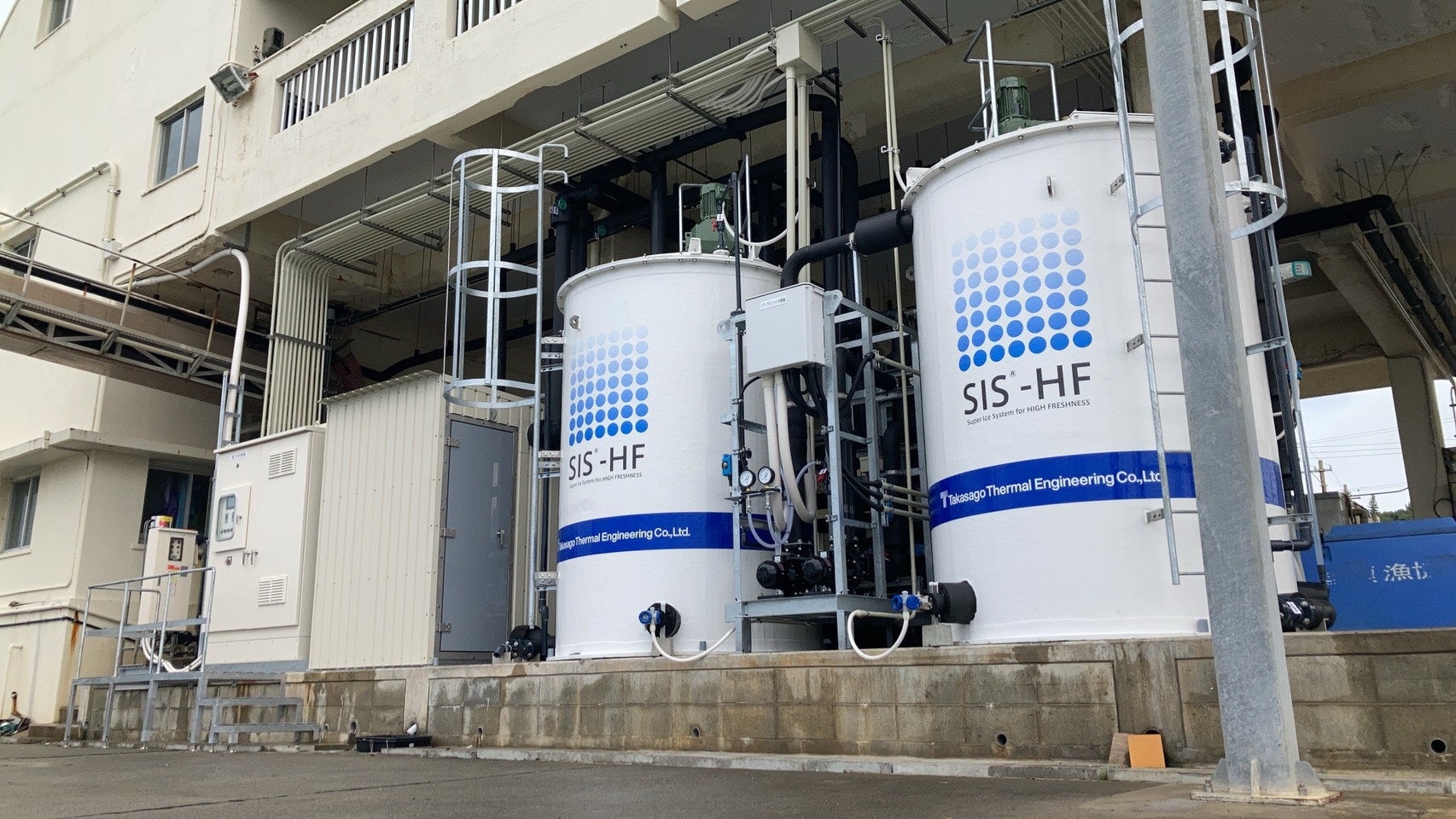 高砂熱学が空調設備業で培った「氷」を作る技術を応用し開発した、水産物向けのシャーベットアイス製造機「SIS-HFⓇ(スーパー アイス システム ハイ フレッシュネス)」。製造される氷は、最大でも粒径0.05mm程度ときめ細かく滑らかで、魚体を傷つけず、急速・均一に冷却することが可能。氷濃度は、従来型のかき取り方式シャーベットアイスの約2倍に当たり、塩分濃度の調整によって魚が絶対に凍らない-1℃を維持した上で、氷蔵保存時間も約2倍になるため物流範囲を拡大できる。