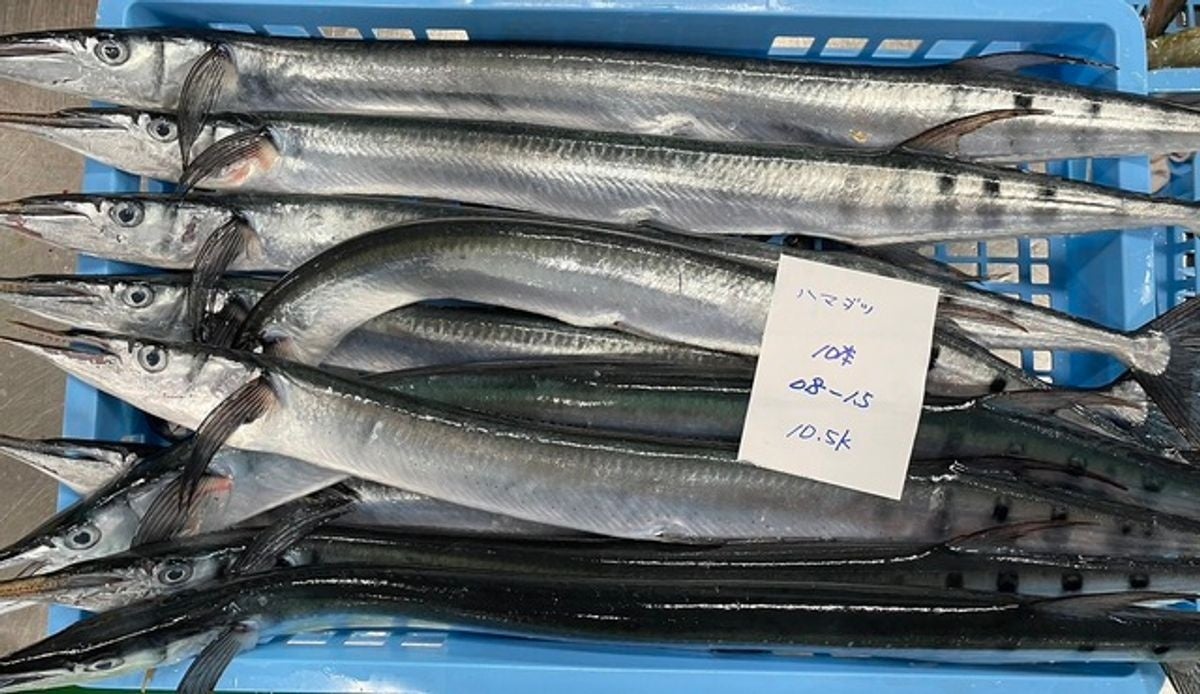 ハマダツは刺身で是非!身質はトビウオなどに似ており、からし酢味噌で食べるのがおすすめです。刺し盛りで映えるようにツノがついたままで入荷です。