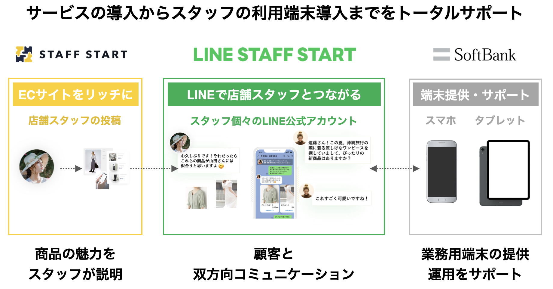「STAFF START」の顧客提案に関するパートナー契約を、ソフトバンクと締結。店舗スタッフ個々のLINE公式アカウントでオンライン接客できる「LINE STAFF START」も販売