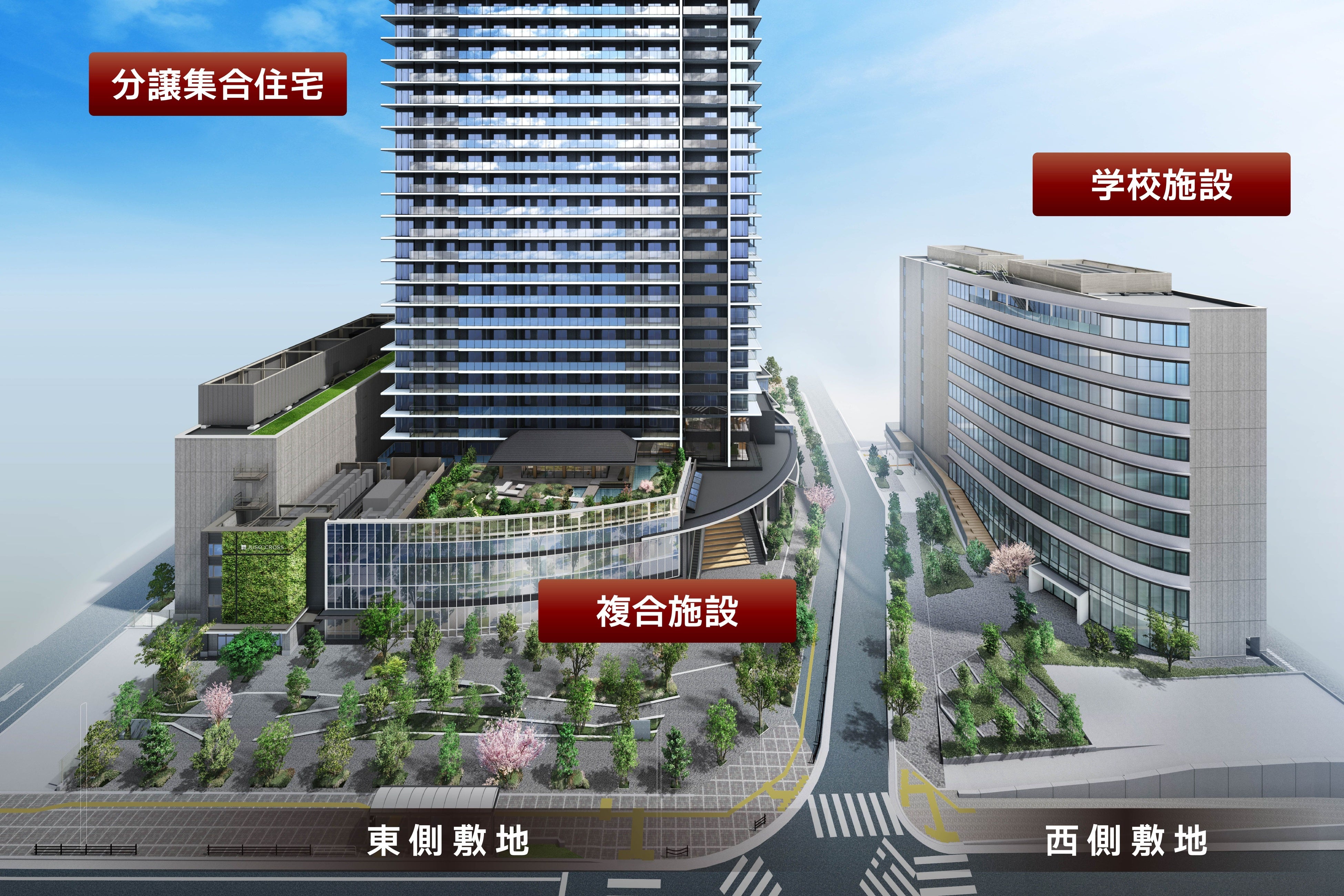 また本プロジェクトは、大阪市が実施した「もと淀川区役所跡地等活用事業」において阪急阪神不動産株式会社および当社が事業者に選定され、十三の新たな発展とにぎわいを創出する地域共創型プロジェクトとして「官・民・学」が一体となって進めてきた開発事業です。施設は東西2つの敷地から構成されており、西側敷地には当社にて設計・施工を手掛けた学校法人履正社が運営する医療系専門学校が2024年4月に開校しています。東側敷地においては、712戸の超高層タワーレジデンス「ジオタワー大阪十三」をはじめ、図書館、保育・学童施設、スーパーマーケットなど、新たな生活環境が整備されます。