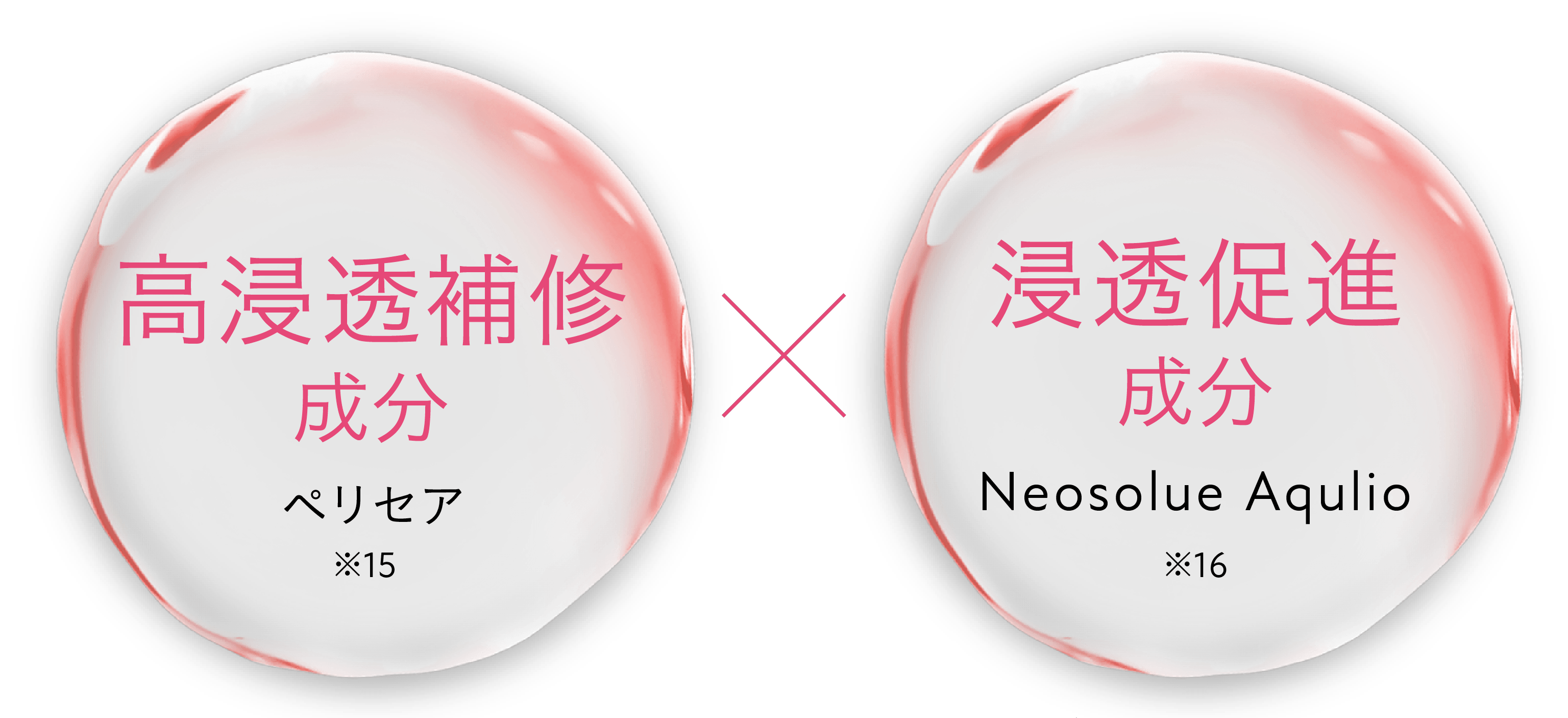 高浸透補修成分と浸透ケア成分を掛け合わせることで美容成分を髪内部にすばやく届けながら、毛髪補修成分とキューティクルケア成分*が髪の内部・外部からダメージを補修します。