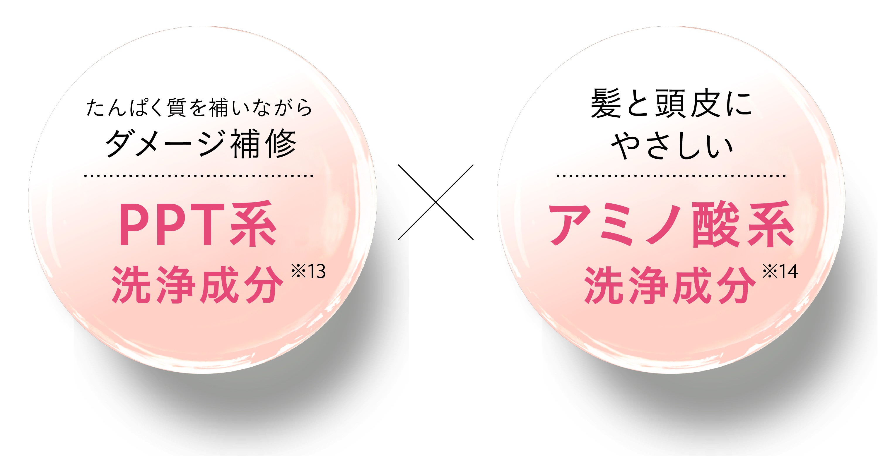 ダメージ補修をしながら洗い上げるPPT系洗浄成分※13と、髪と頭皮をやさしく洗い上げるアミノ酸系洗浄成分※14をW採用。髪と頭皮をいたわりながら、毛髪ダメージにアプローチします。