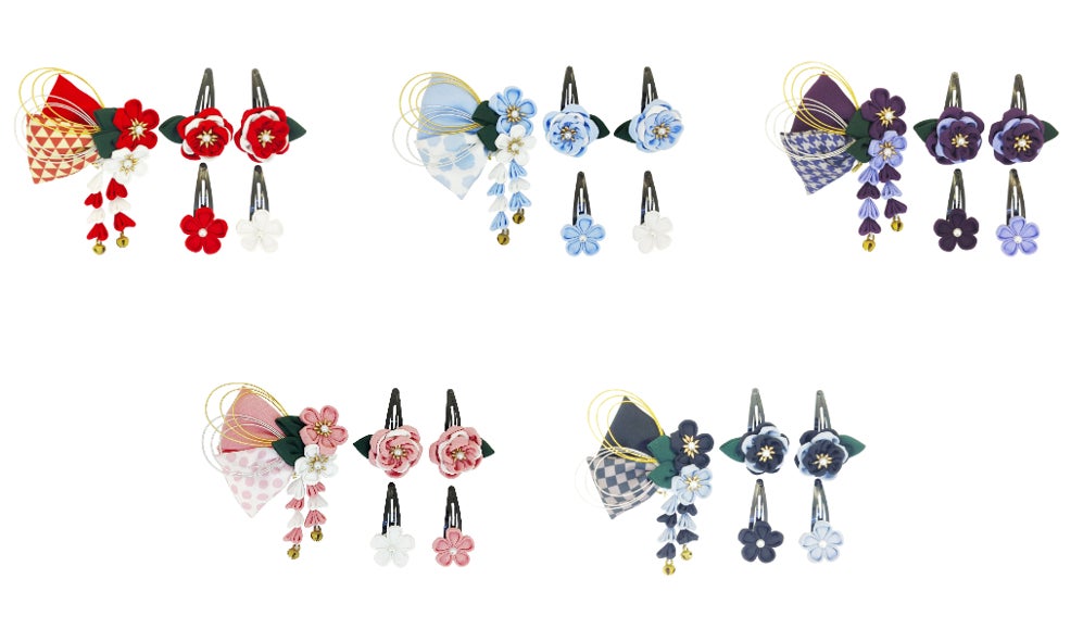 日本の伝統技法「つまみ」で仕上げた、一重咲きと八重咲きの梅の花をメインに、和柄のリボンを組み合わせた可憐なデザイン。日本の伝統的な色を使いつつ、現代の着物にも合う色合いで、七五三の子どもたちの晴れ姿を一層引き立てます。伝統を守りながらも、現代風の着物にも調和するデザインが特徴。後ろがスリーピン(パッチン留め)タイプなので、お子様の柔らかい髪にも簡単に装着可能です。