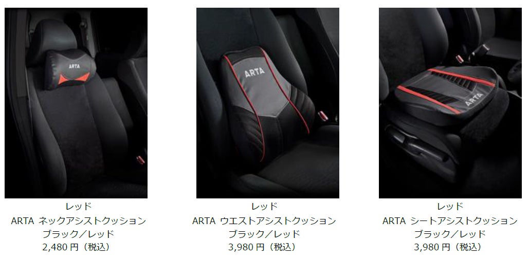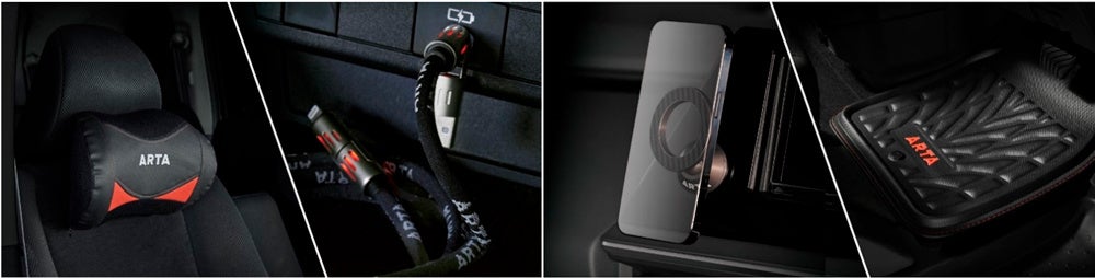 快適な乗り心地をサポートするクッションや、レーシングタイヤを彷彿とさせるトレッドパターン調のフロアマット、重厚感のあるスマホスタンドをはじめとするガジェット類など、ARTAが表現する「タフで非日常」な世界観をトータルコーディネートで楽しめるラインアップです。