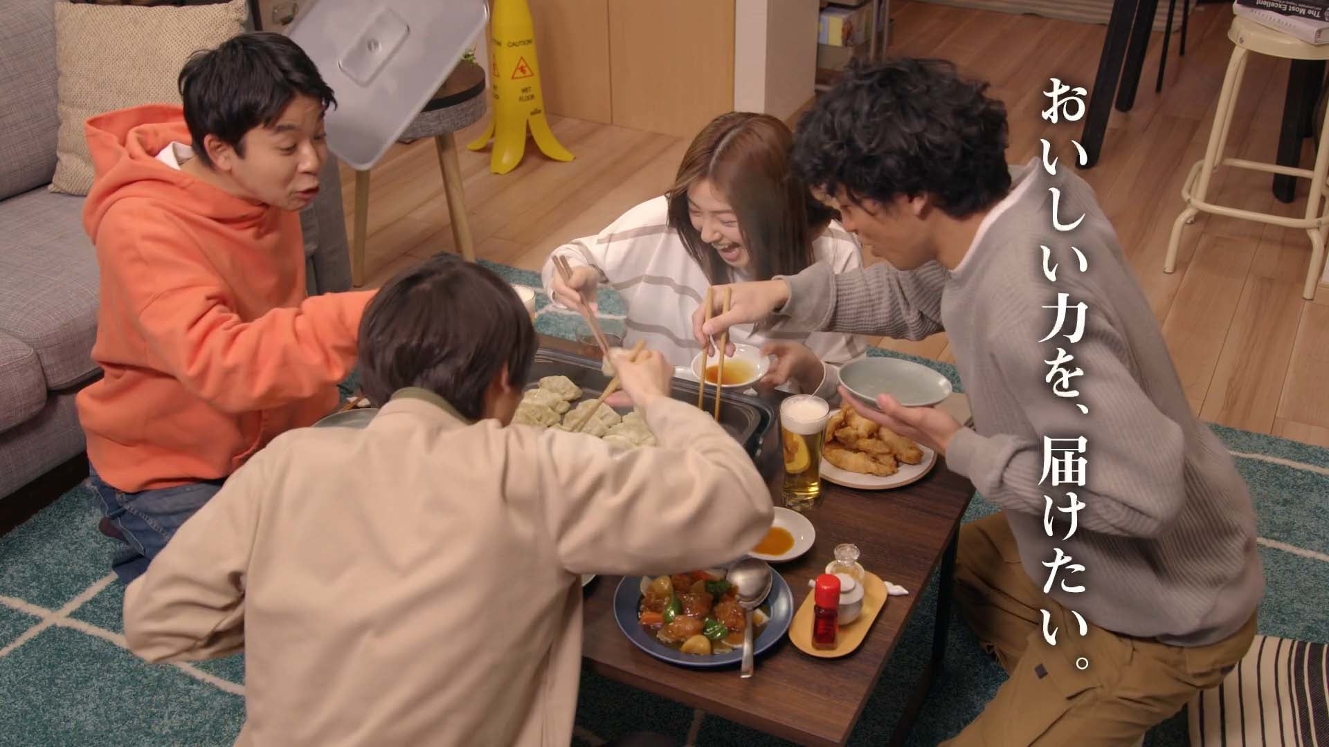 コロナ禍により食事のスタイルは「家族と自宅派」が増加。当社のテイクアウトご利用のお客様もこの2年で約2倍になっています。コロナ収束後の近未来は、そのシーンにさらに仲間も加わり、ホームパーティもできることでしょう。早くそんな日が訪れてほしいという願いを込めています。仲野太賀さんが友人とホームパーティを開こうとすると、全員が餃子の王将のテイクアウトメニューを持ってくるという、「食でも意気投合」する仲間の楽しそうな様子を明るくコミカルに表現しました。