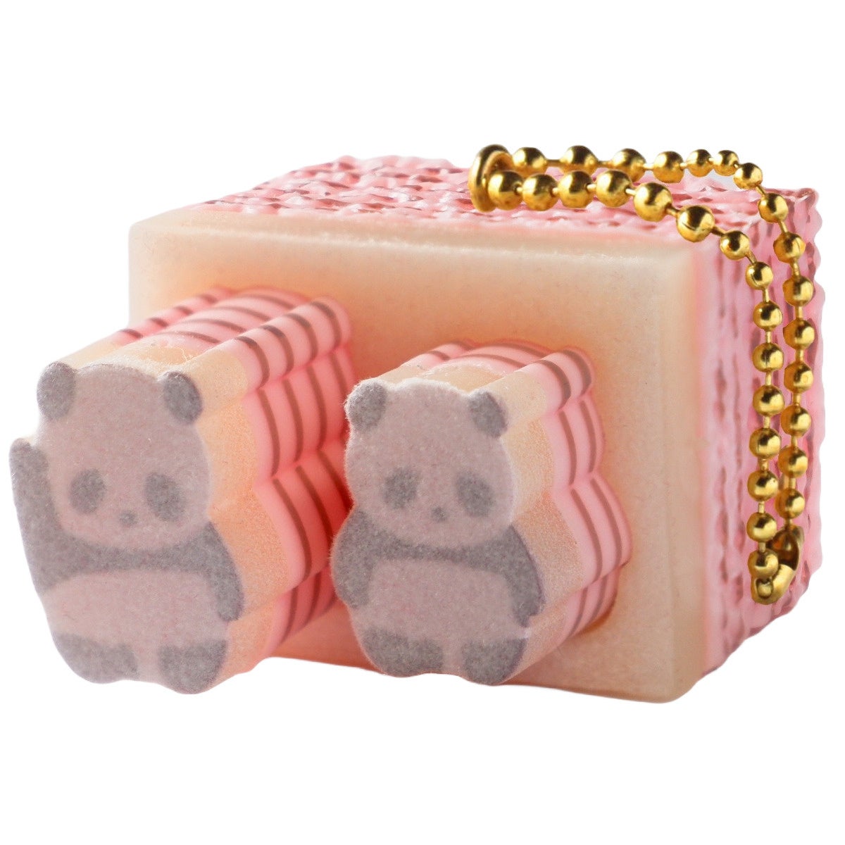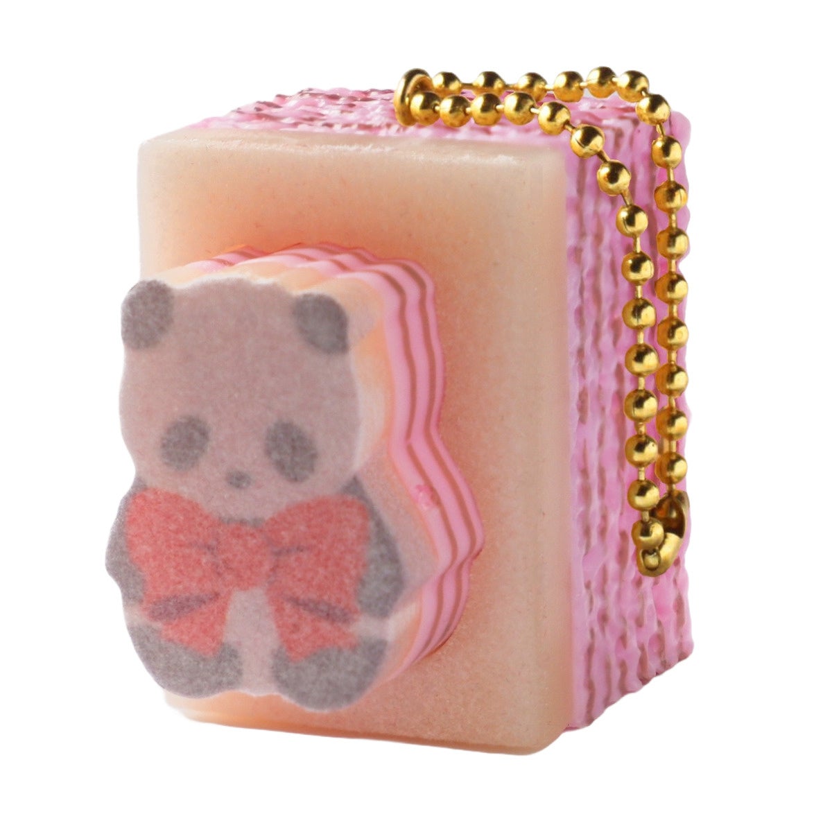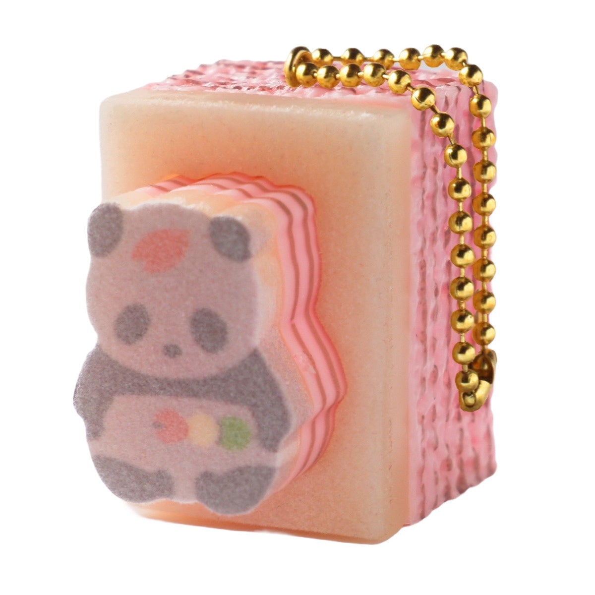 実際のパンダバウムと同じように型ぬきができちゃう、遊び心のつまったミニチュアキーホルダーができました。白生地の部分はふんわりすべすべな手触り、各バウム生地の色味の違い、質感も丁寧に表現されています。