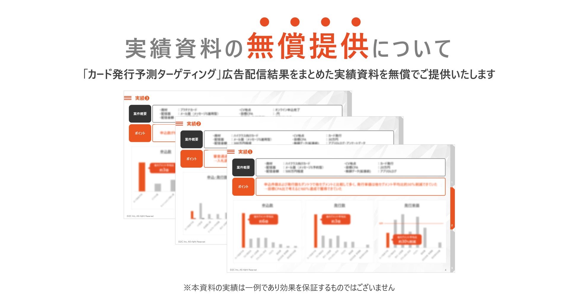株式会社 D2C(本社:東京都港区、代表取締役社長:高田 了、以下 D2C)及び株式会社D2C R(本社:東京都港区、代表取締役社長:豊永 雅史、以下D2C R)は、株式会社NTTドコモ(本社:東京都千代田区、代表取締役社長:前田義晃、以下ドコモ)が保有するデータと、ドコモの独自AIエンジン「docomo Sense®」の拡張機能を活用した広告ソリューション「カード発行予測ターゲティング」を昨春より提供いたしております。(https://www.d2c.co.jp/news/2024/04/04/6881/) この度これまでの広告配信結果をまとめた実績資料を無償で公開致します。