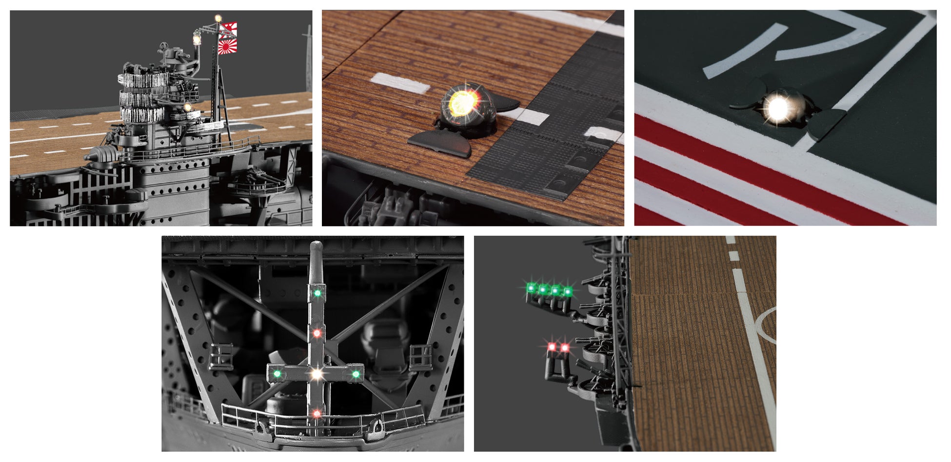 夜間作戦において重要な役割を果たした探照灯・艦内灯・艦尾灯は1色のライトで、艦尾信号灯・着艦誘導灯は赤緑白など複数色のライトで点灯。