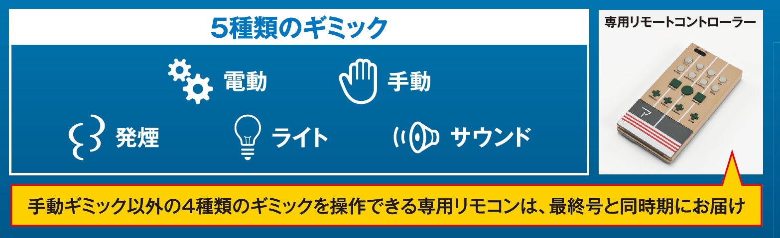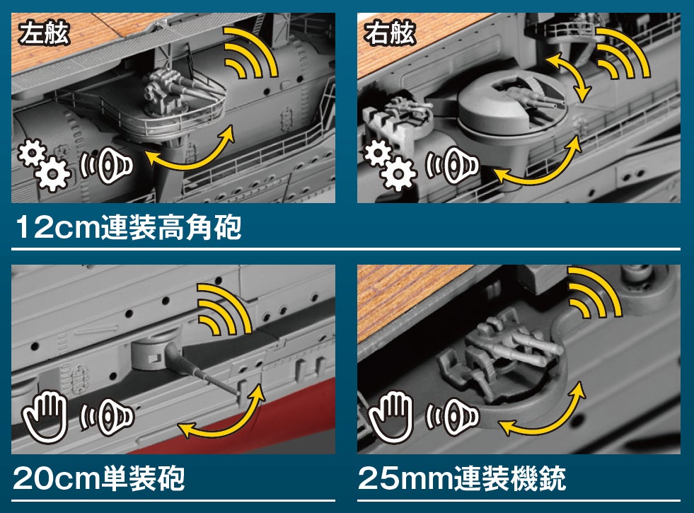 真珠湾奇襲攻撃をはじめ、史実ではほぼ活用されず幻となった各種艦載砲など、発煙・ライト・サウンド・電動・手動のさまざまなギミックを専用リモコンとともにあなたの手で指揮できます。