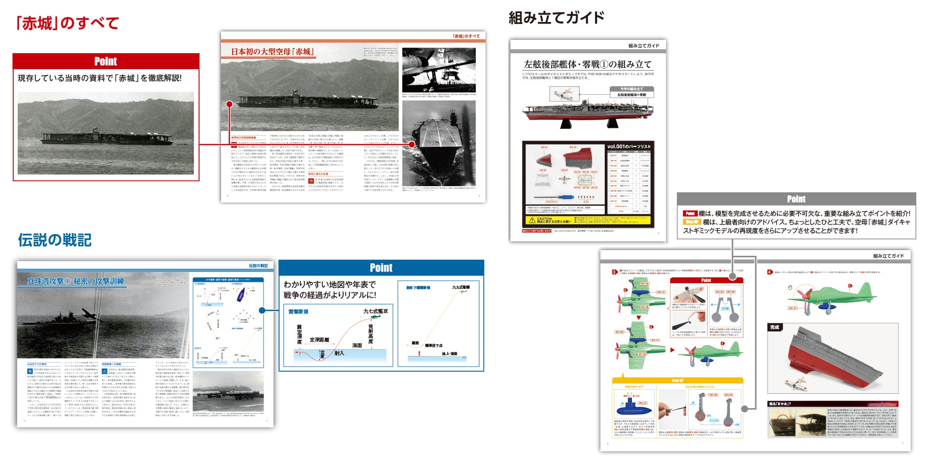 毎号のマガジンは、模型の組み立て方をわかりやすく解説する組み立てガイドをはじめ、多彩なビジュアルと貴重な資料が豊富な6つの章で構成されています。