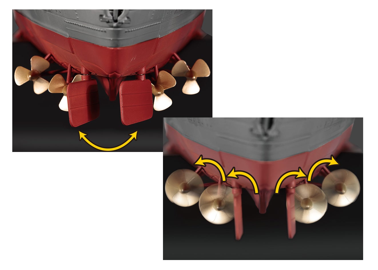 長期にわたる航行において大事な役割を担った主舵2基は左右最大35°の舵角に電動で旋回が可能。スクリューも4軸とも電動で回転が可能です。