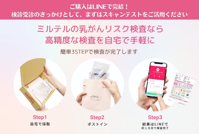 当社の連結子会社である株式会社ミルテル(本社:広島県広島市、代表取締役社長:加藤 俊也 以下、ミルテル)は、大丸松坂屋カード等を発行するJFRカード株式会社(本社:大阪府高槻市、代表取締役社長:橋本 尚弥 以下、JFRカード)が運営するQIRA[キラ]ポイントの交換賞品提供の取り組みに続き、JFRカードの会員優待商品としてLINE完結型の乳がんリスク検査サービス「スキャンテスト 乳がん」の販売を開始いたしました。