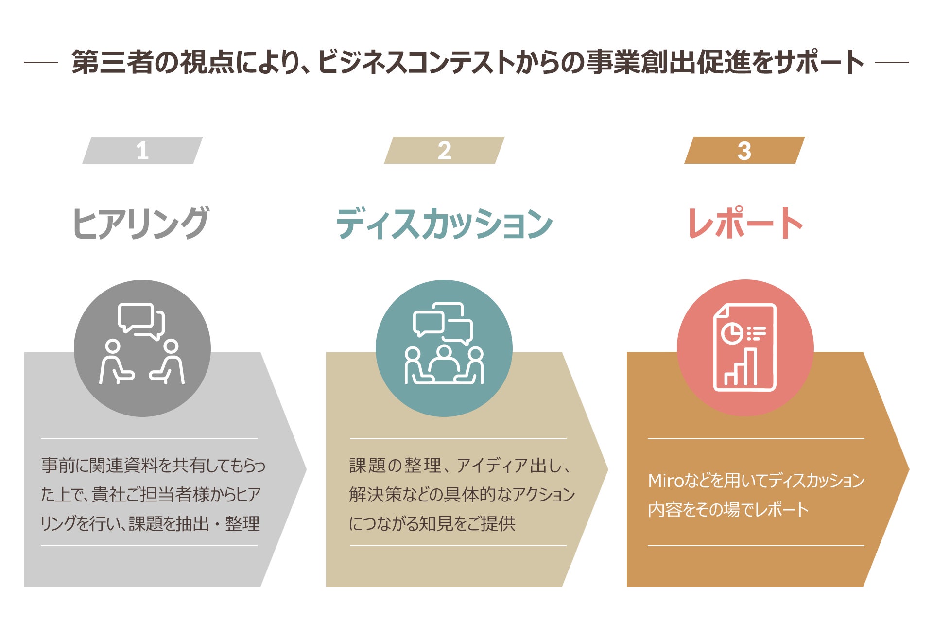 セカンドオピニオンサービスは、ビジネスコンテスト参加に向け準備を進められている担当者様に対し、現状のヒアリングを通し、その後のプロジェクト進行に関して行うべき具体的なネクストアクションについてフィードバックを行うプログラムです。