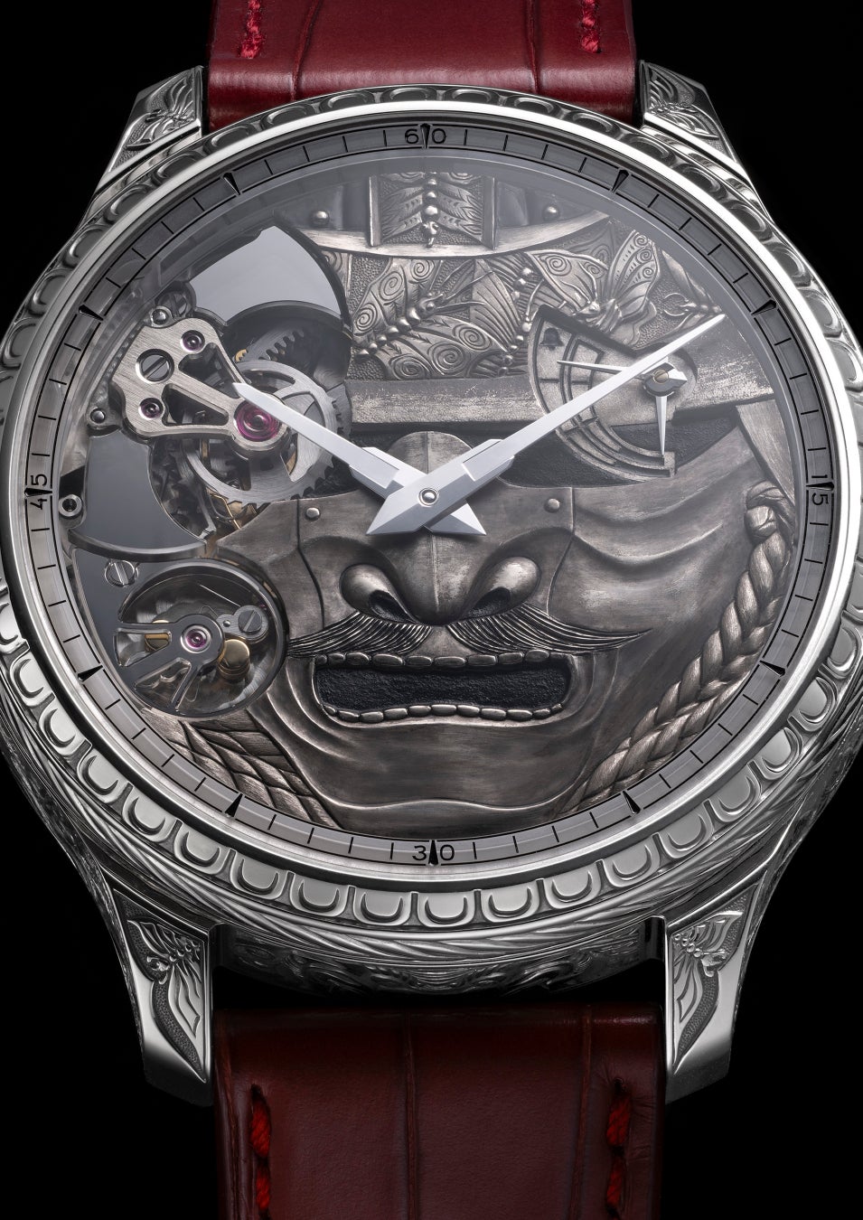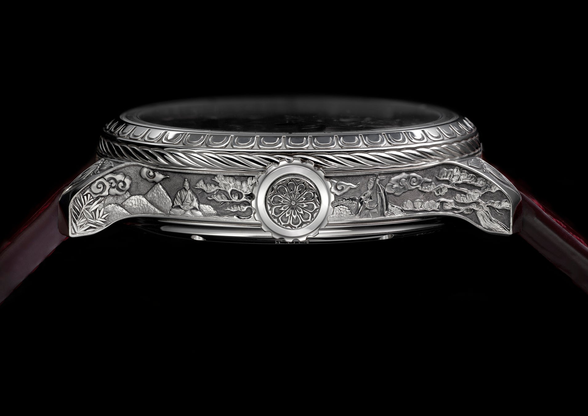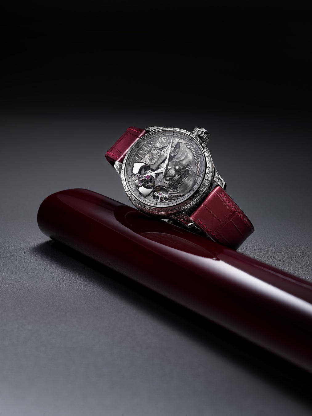 最初に紹介するのは、「L.U.C フル ストライク」のユニークピース。武士の世界観とその規範となる道徳観にインスピレーションを得たこのタイムピースは、一つひとつの手彫りのディテール装飾が物語を紡ぐ、豊かな表現を湛えた芸術的クリエイションです。「L.U.C フル ストライク スピリット オブ ザ・ウォリアー」に搭載されたミニッツリピータームーブメント「L.U.C 08.01-L」にも、手彫りによる装飾が施され、比類なきクリスタルクリアな音色を奏でます。その卓越した職人技と仕上げの美しさは、誉れ高いジュネーブ・シールの品質認証によって裏打ちされています。