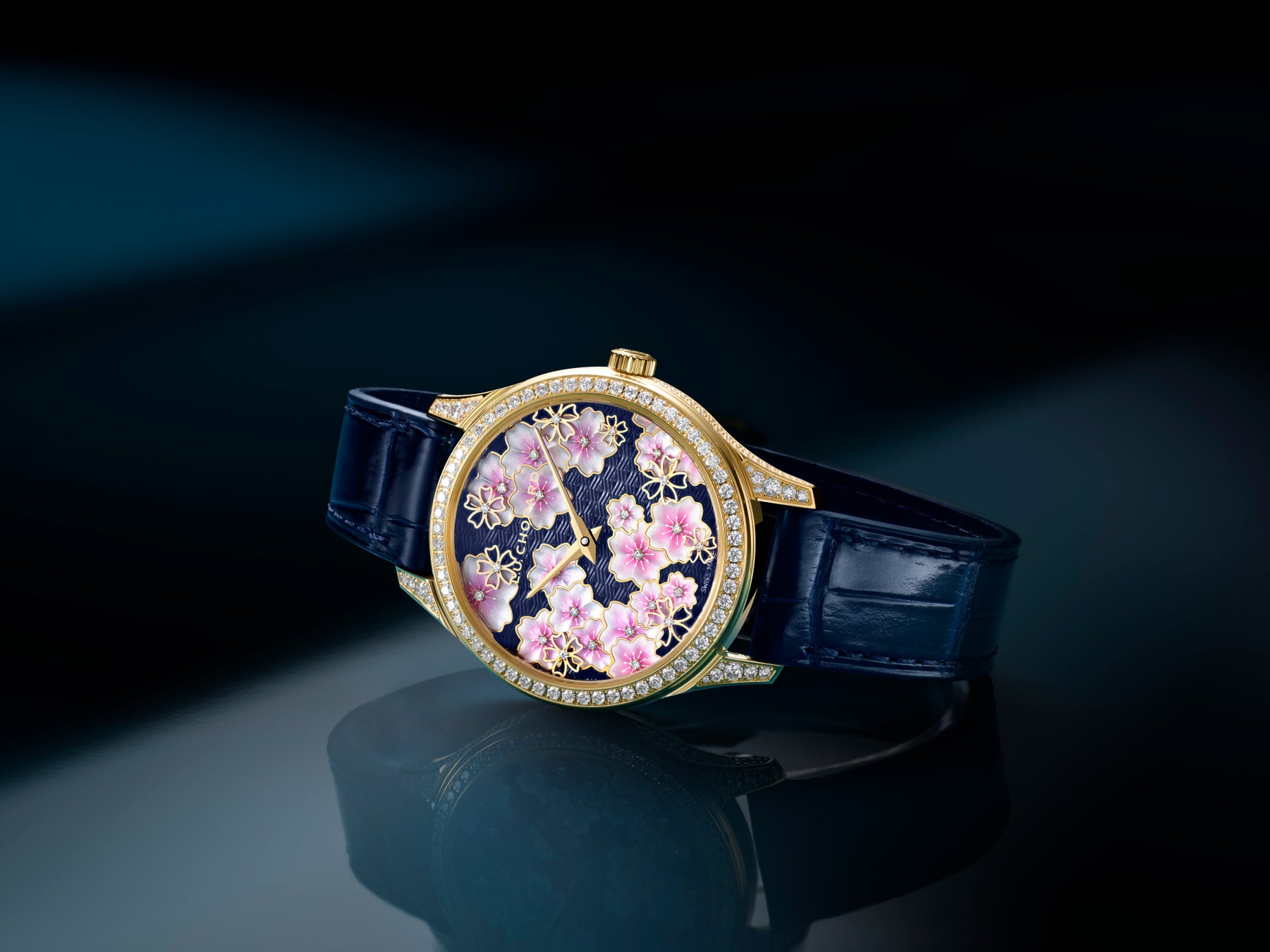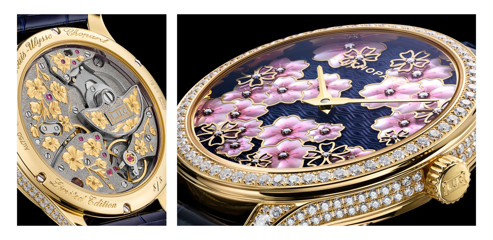 最後に紹介する「L.U.C サクラ バイ ナイト」は、儚き美の象徴である夜桜を愛でる静穏な情景へオマージュを捧げます。ギョーシェ装飾、トランスルーセントなラッカー仕上げ、彫刻が施されたマザーオブパール、そしてオープンワークのゴールドを組み合わせた文字盤では、ダイヤモンドが印象的な奥行き感を演出しています。伝統的なフルリザンヌ彫りによる装飾を施したムーブメント「L.U.C 96.23-L」は、ホワイトゴールド製のブリッジやマイクロローターにいたるまで究極の洗練を湛えています。8本限定エディションの「L.U.C XP サクラ バイ ナイト」は、超薄型設計と65時間におよぶパワーリザーブを誇ります。