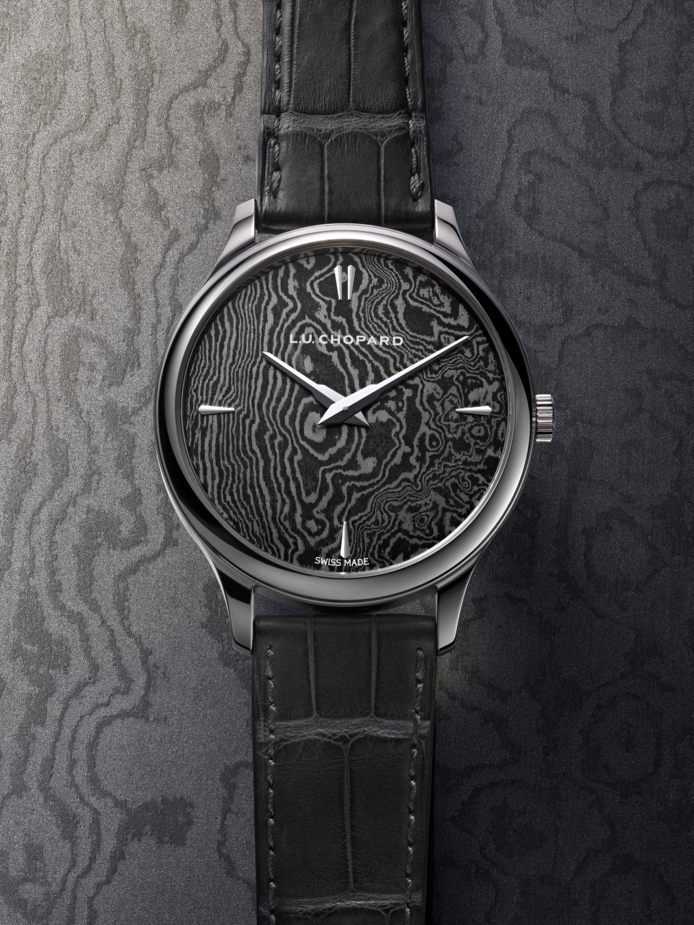 日本の伝統的なクラフツマンシップの真髄を探求し続け、今回発表された「L.U.C XP 日本刀」は、25本の限定エディション。文字盤は、日本刀の“聖なる鋼”である「玉鋼(たまはがね)」から着想を得た技法を用い、ダマスカス鋼から職人の手によって丹念に作り上げられています。120~160層の鋼板を重ねて制作された唯一無二の文字盤は、炎の揺らめきを想起させるモアレ模様が浮かび上がり、無常観を説く禅の哲学を映し出しています。その洗練された美学は、22Kゴールド製マイクロローターと65時間のパワーリザーブを備えた超薄型ムーブメント「L.U.C 96.41-L」の高い精度によって、さらに研ぎ澄まされています。権威あるジュネーブ・シールの品質認証を取得した「L.U.C XP 日本刀」は、伝統的なクラフツマンシップと現代の革新性が融合した稀有な芸術作品です。
