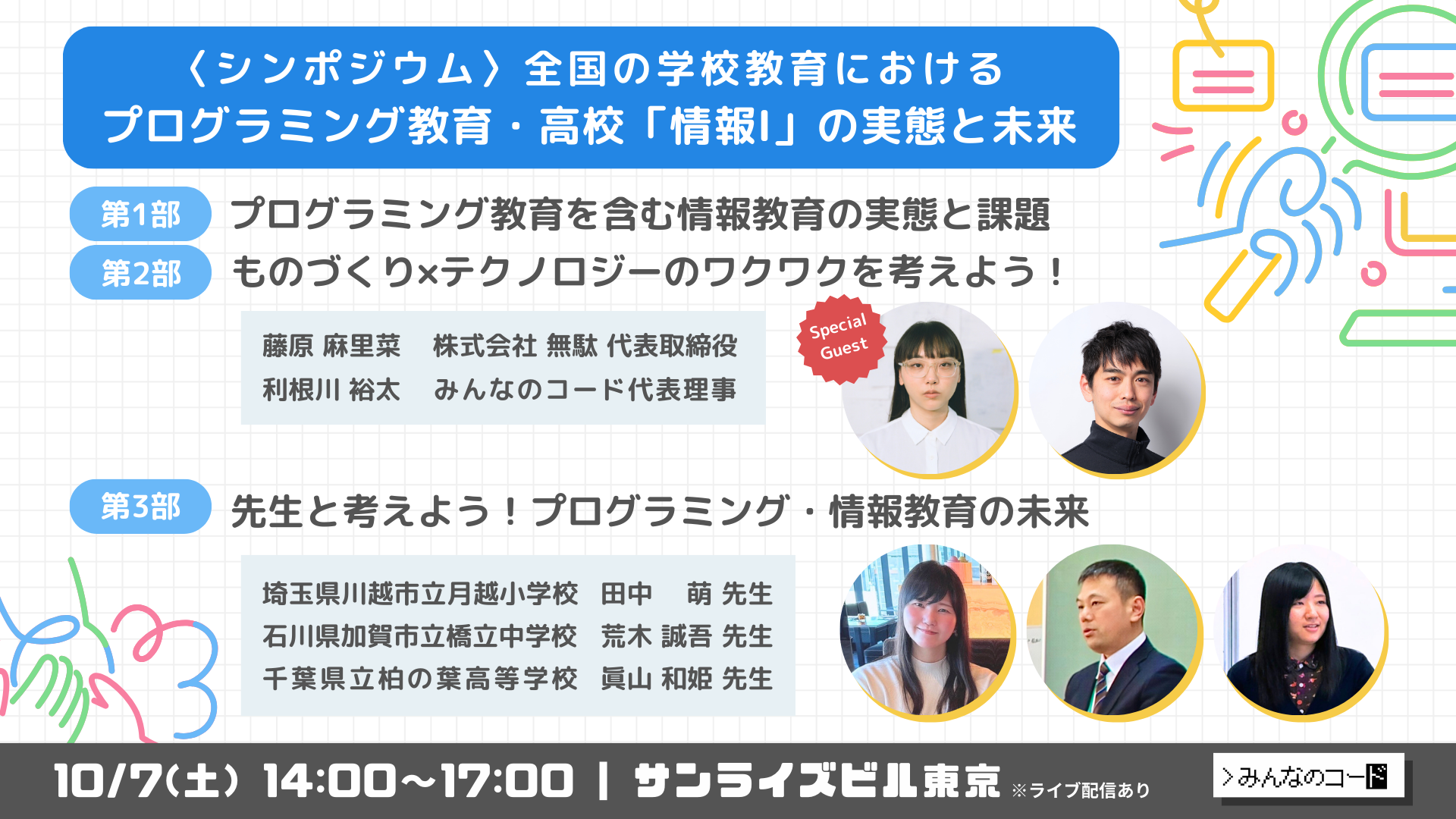 さらに、スペシャル対談には、藤原麻里菜さん(株式会社 無駄 代表取締役)にご登壇いただきます。また、トークセッションには、田中 萌先生(埼玉県川越市立月越小学校)、荒木 誠吾先生(石川県加賀市立橋立中学校 技術・家庭科 技術分野)、眞山 和姫先生(千葉県立柏の葉高等学校 情報科)をゲストにお招きし、テクノロジーについて学ぶ楽しさと今後の日本におけるプログラミング・情報教育を、みなさんと一緒に考えていく内容となります。
