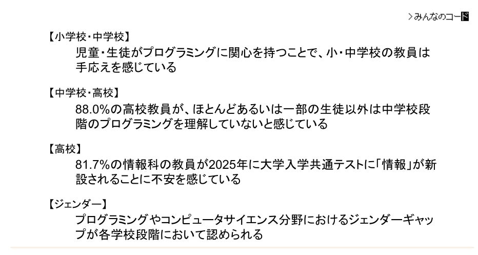 (ご参考)みんなのコード、全国の学校教育における「2022年度 プログラミング教育・高校「情報Ⅰ」実態調査」を公開