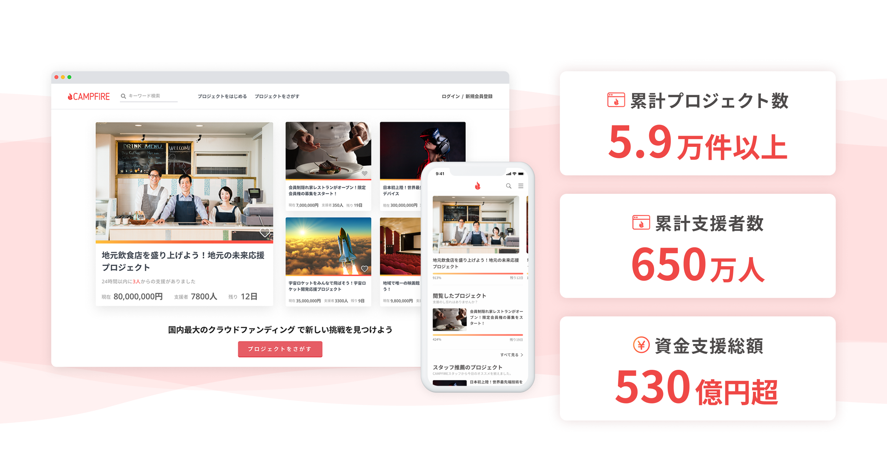 一方CAMPFIREは、「一人でも多く一円でも多く、想いとお金がめぐる世界をつくる。」を掲げ、個人や企業、またプロジェクトのジャンルや規模に限らず、あらゆる事業フェーズにおけるクラウドファンディング活用をサポートしてまいりました。サポートしたプロジェクト数は59,000件、累計支援者数は650万人、支援総額は530億円にのぼります。