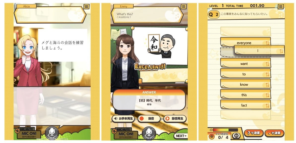 この課題を解決するため、話す力を育む対話型英会話アプリを開発。学習内容は学習指導要領に準拠、小学校・中学校の授業で活用しやすい学習ツールとなっています。本アプリにはゲーム要素を盛り込み、英語学習に重要なモチベーションを維持した学習が可能。また「会話」だけでなく「単語」「文法」の3つの要素も習得できます。教員の方においても、管理画面で児童生徒の学習状況、学習結果を把握することができ、児童生徒への適切な対応ができるようになります。