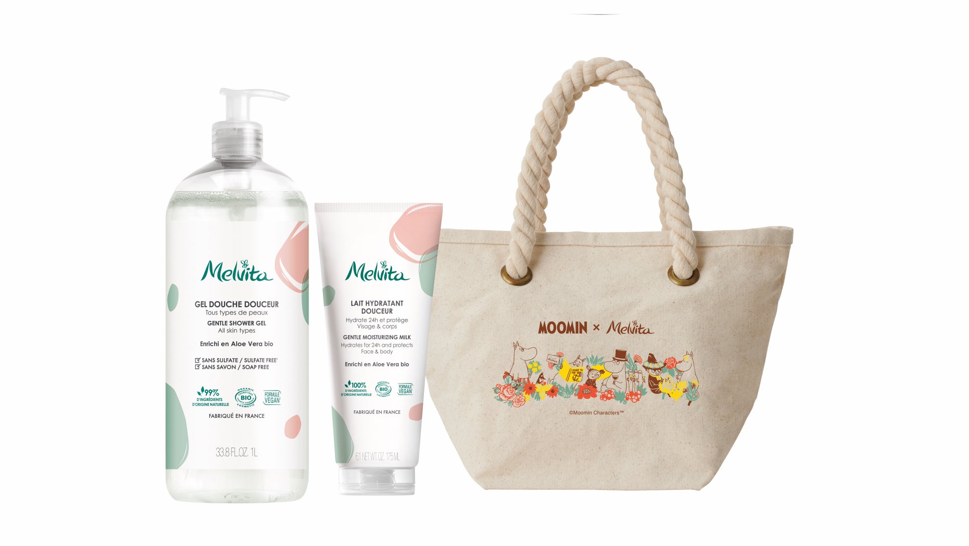 肌にピュアでみずみずしいうるおいを与える、ボディケアセットをムーミントートにイン!